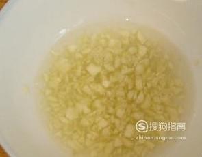 我们要加入一些蒜泥水,把大蒜剁碎,里面加入清水,蒜泥,味精,盐,醋,调均匀