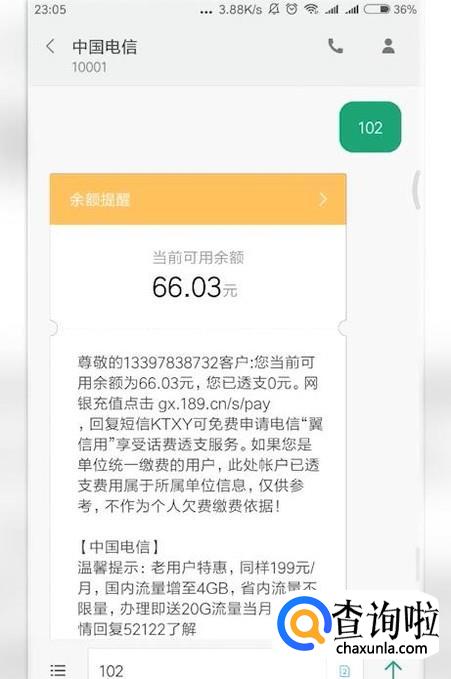 短信发送指令代码【102】到【10001】,稍等一会就能收到本机话费余额的短信了。