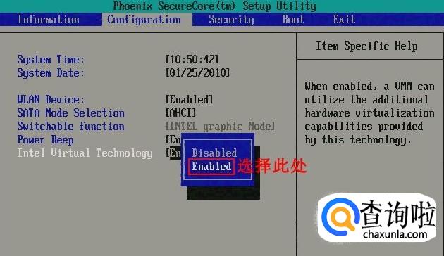 还有一种方法就是进入BIOS界面后选择“Configuration”选项,然后再选择“Intel Virtual Technology”,接着按一下回车键,如下图所示。