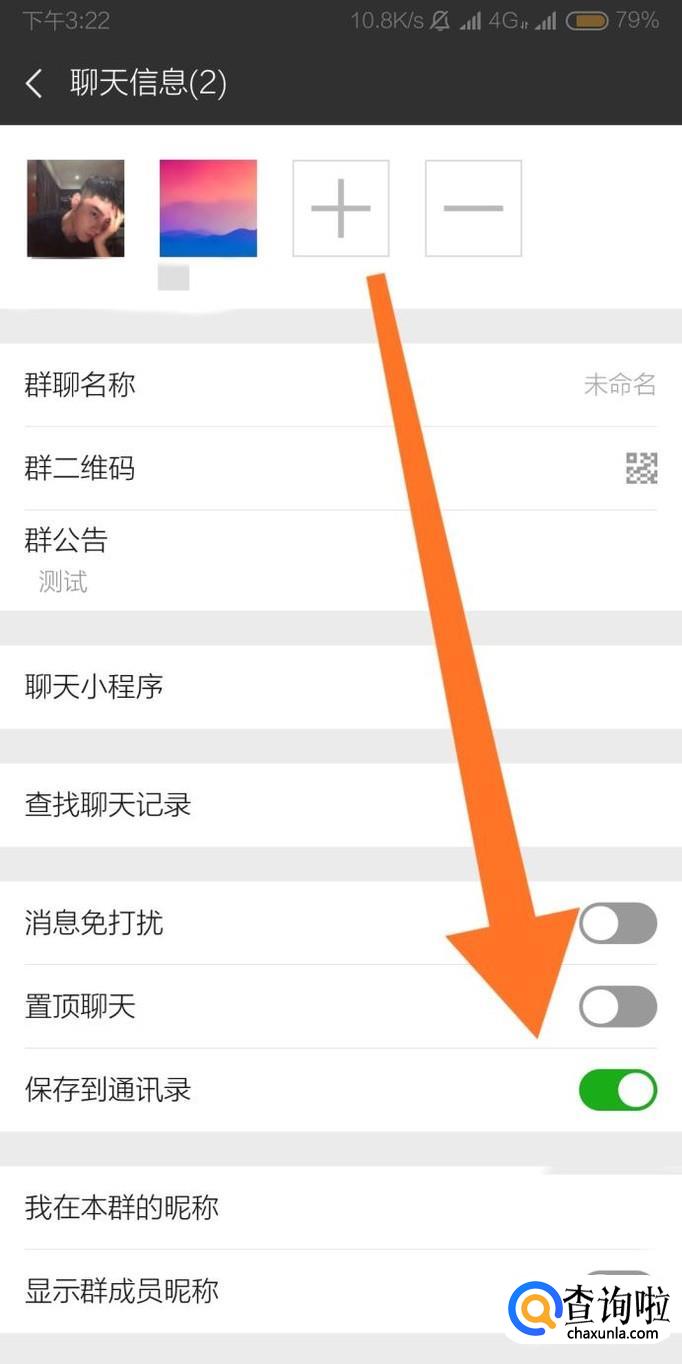 进入微信群聊天信息页面后,勾选“保存到通讯录”选项即可。