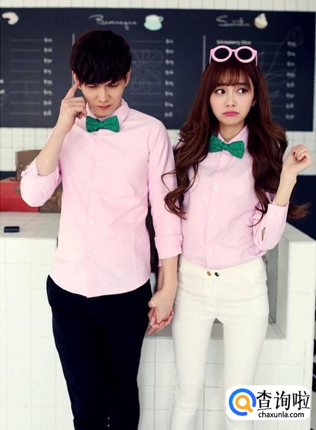 搭配同色衬衣款式情侣装,可以选择休闲长裤作为搭配,也可以使用同色系的领结来装饰;