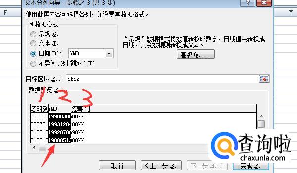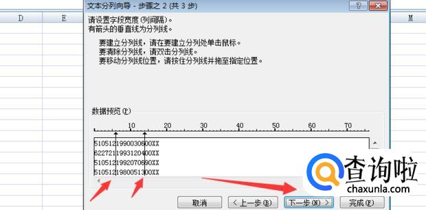 单击数据预览的下方的标尺,把身份证号,分成3段,中间一段为出生年月,点击下一步。