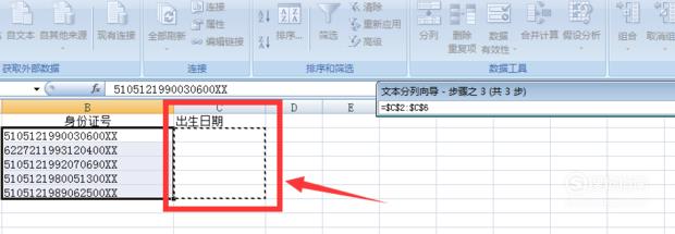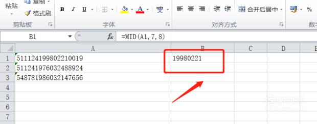 然后在图示的单元格输入=MID(A1,7,8),A1为身份证号的坐标,7为从第7位数字提了起,8为提取8个连续数字。