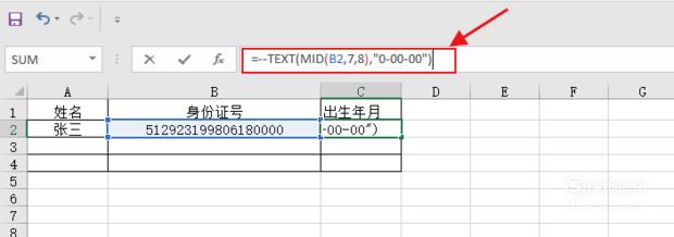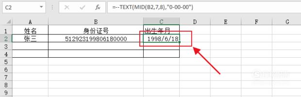 然后在单元格内输入下面的公式:=--TEXT(MID(B2,7,8),"0-00-00")。