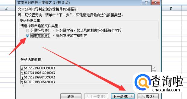 在“分列”对话框中选择“固定列宽”,点击下一步。
