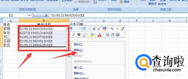 打开EXCEl文件,选择身份证号所在列,点击右键 ,选择复制。