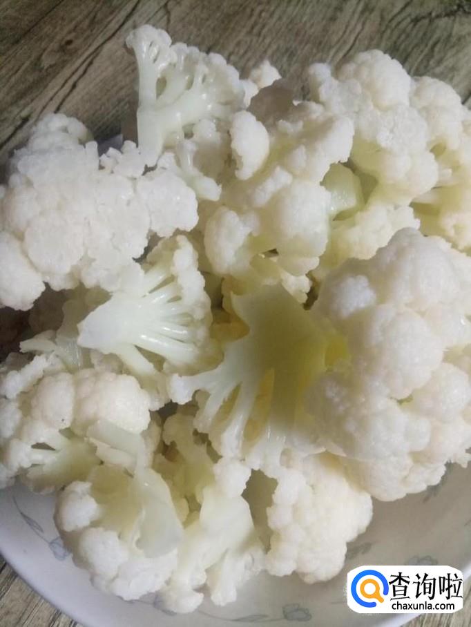 菜花一颗,掰成小块小块的,放水里泡一会,洗净。