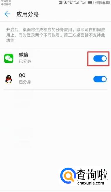 弹出的界面,我们将微信的分身开关向右滑动打开,这样我们就将微信分身了。