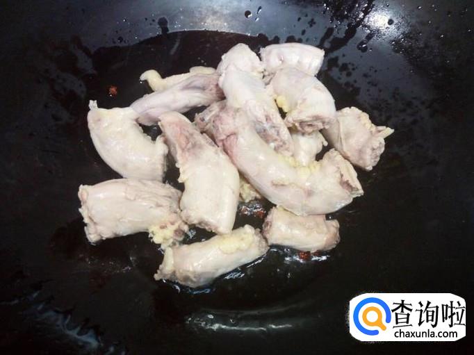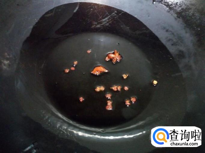锅里放入油加热,油热后放入花椒,八角爆锅,放入鸡脖子翻炒。