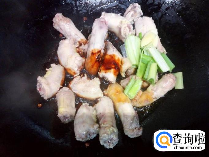 放入葱,姜,料酒,蚝油,酱油,白糖,翻炒一分钟的时间。然后放入水,水没过鸡脖子,放入红干椒,盐,大火烧开,转小火慢炖。
