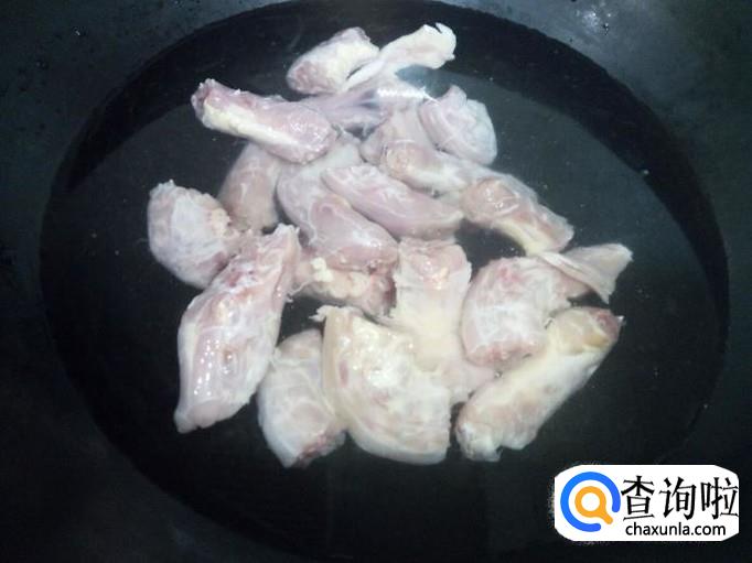 鸡脖子放入冷水锅中烧开,水开后,煮一分钟的时间捞出,用水冲洗干净(血水和沫子),沥干水分。