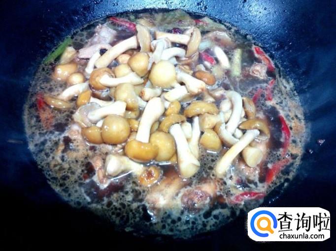 炖至五分钟的时间,放入滑子蘑,转大火烧开,再转小火慢炖。