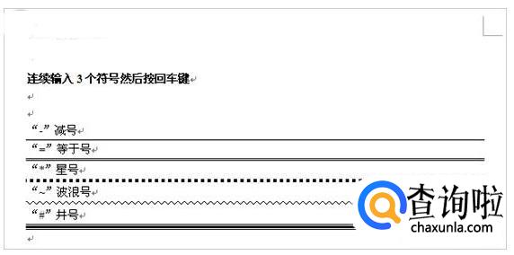 这里说一个很多人都不知道技巧,在Word中只要你连续输入三个以下任意符号:---、===、***、~~~、###,然后按下回车键即可实现一整排横线,效果如图所示。