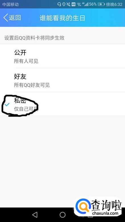 选择私密。这样就成功地设置成在手机qq里不让他人查看我的生日日期了。
