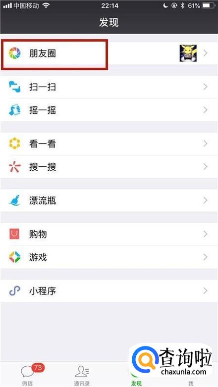 首先点击微信中的朋友圈,如下图所示。