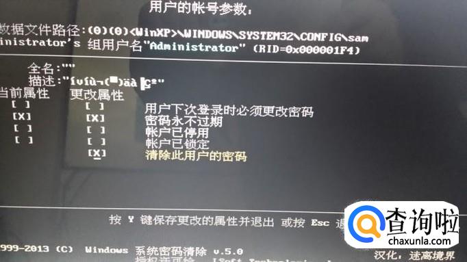 最后会看到“清除此用户的密码”被选定(黄色),就按Y键保存,然后重启电脑即可直接进入系统,密码也被清除了。