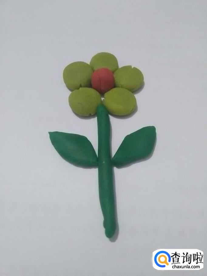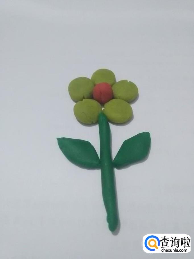 再用绿色捏成扁片,两端捏尖一些,捏成两片叶子,将两片叶子粘在花茎的两边,粘土花朵就做好了。