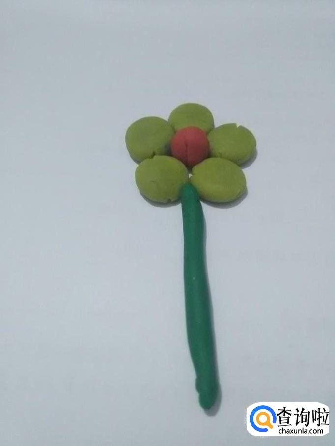用一块绿色搓成细细的条,粘在花朵下面,当作花茎。