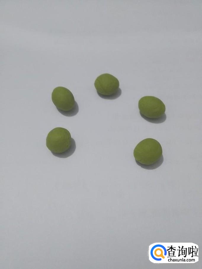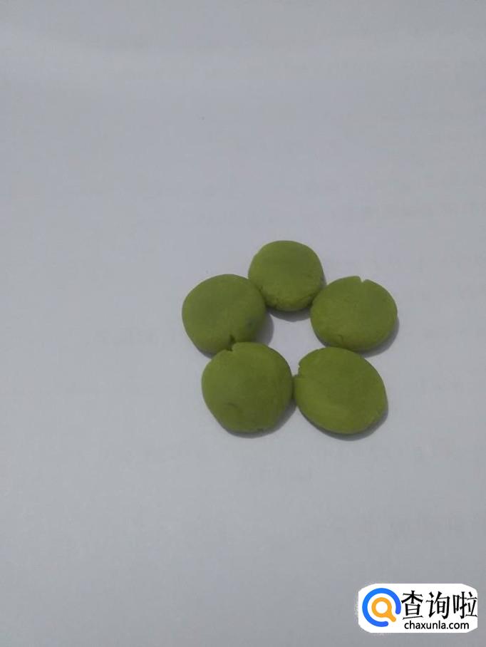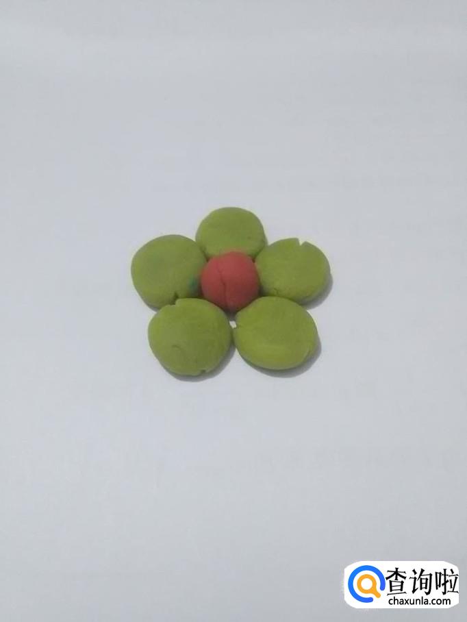 先用黄色团成五个圆球,再按成五个扁片,当作五片花瓣,将五个小圆片围在一起,围成一朵花。