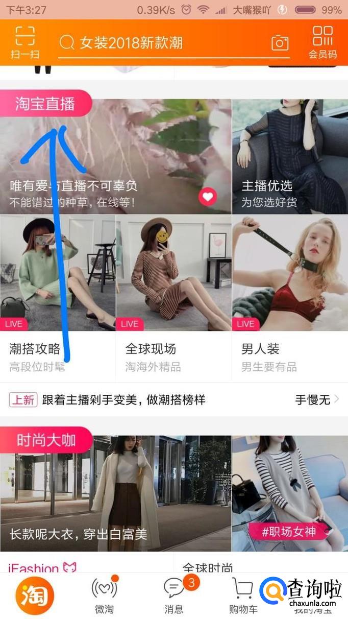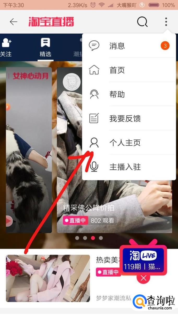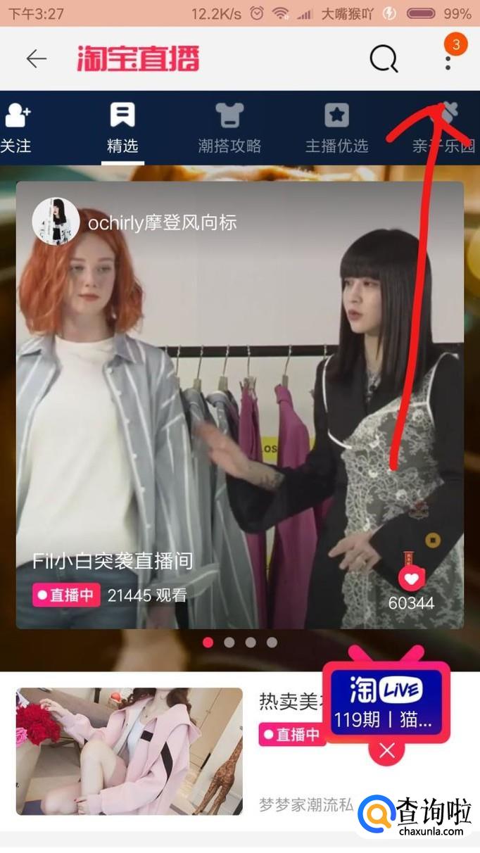 点击进去就是淘宝直播的首页界面,这里面都是目前在直播的人,你也可以点进去看看别人的直播!点击箭头指的三个点指标!
