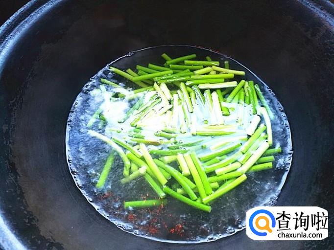 锅里加适量的清水,开火烧开,加入切好的蒜苔焯一下,把焯好的黄绿椒出锅凉一会备用。