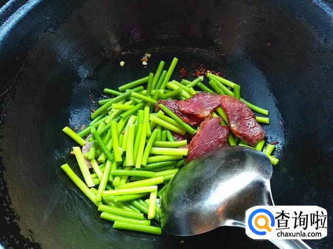 加入焯好的蒜苔和适量的食盐一起爆炒入味。