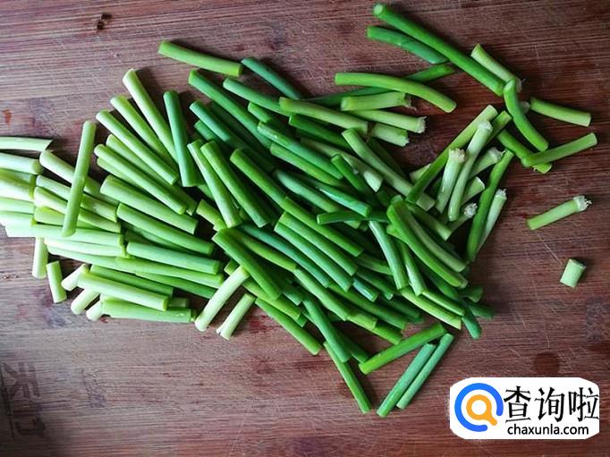 蒜苔洗净切成如下的段备用。有蒜苔就不用放葱了,因它们都是辣的,放多了就影响口感。