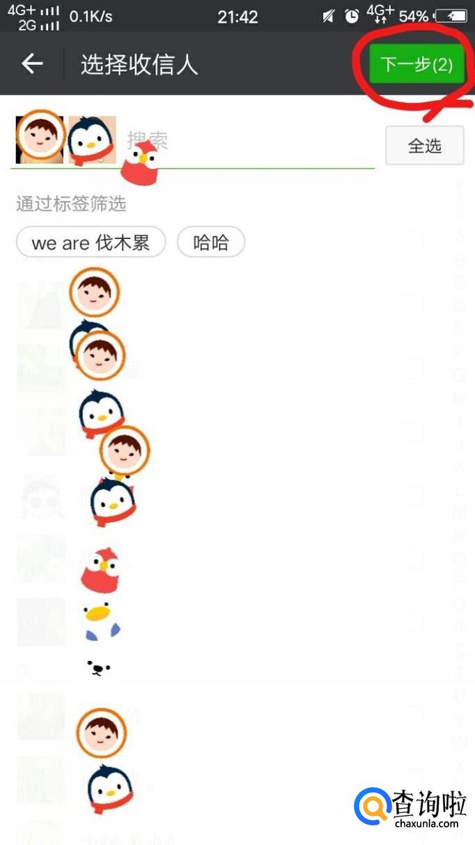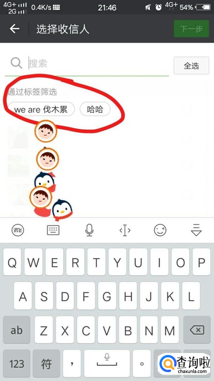 最后,我们在搜索处轻轻点击一下就会跳出“通过标签筛选”,选择你想要群发的标签,然后勾选相应的联系人,点击“确定”过后点击“下一步”,输入你想要发送的信息即可