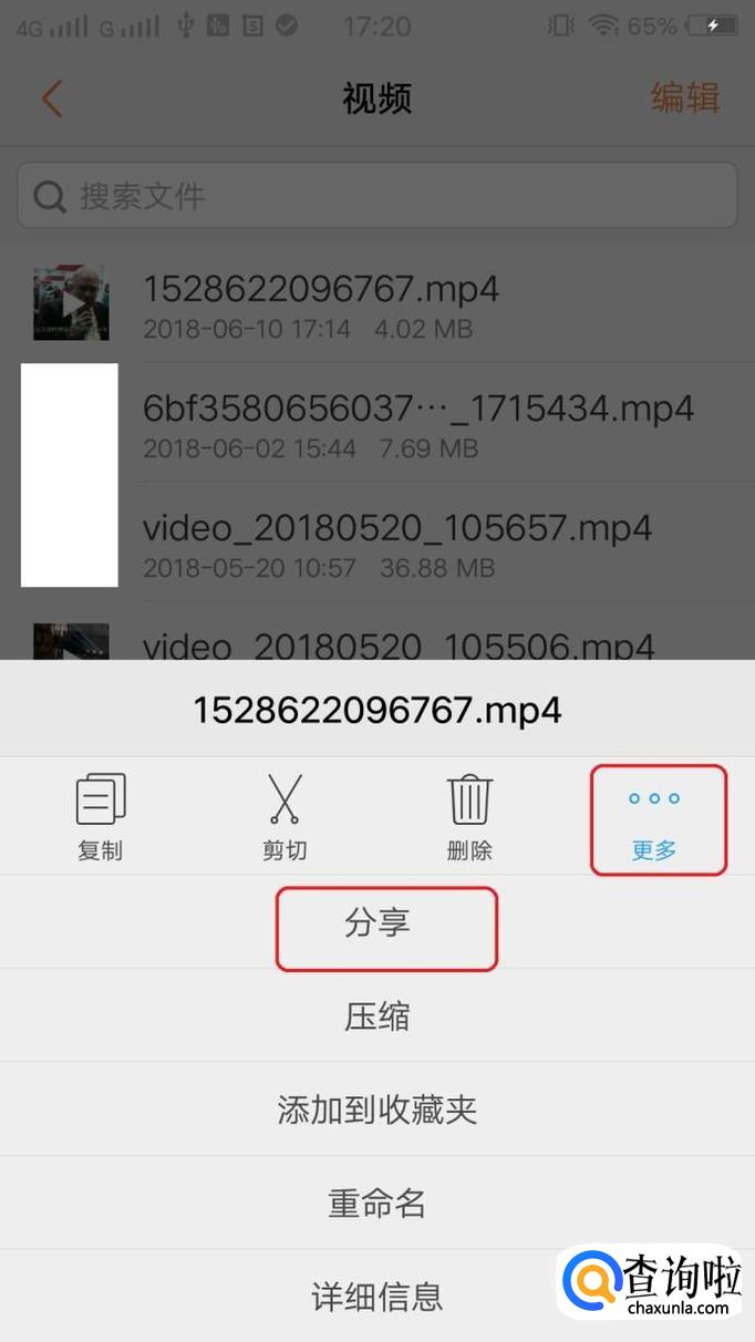 找到视频后,长按该视频,在弹出菜单中点击“更多”,选择“分享”就可以了,可以发送到电脑,也可以保存到别处。