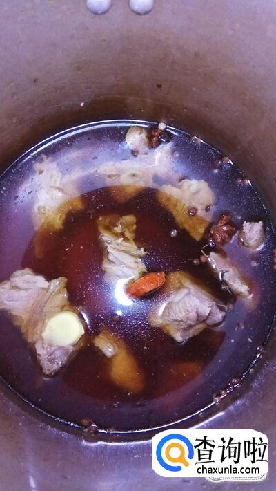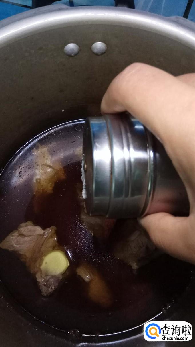 将做好的料汁儿倒入高压锅中,料汁一定要没过排骨,再放入适量盐,盖上高压锅的盖子,大火烧开,转小火,压上18分钟。