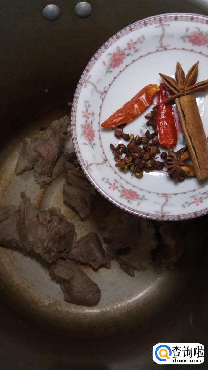 将排骨捞出,放入高压锅,放入适量桂皮,八角,花椒,干辣椒等大料,再放入几片生姜。