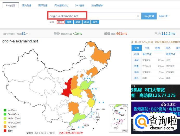 打开浏览器,输入网站http://ping.chinaz.com/,选择你的宽带运营商,输入origin-a.akamaihd.net,点击右边的<PINGj检测>。