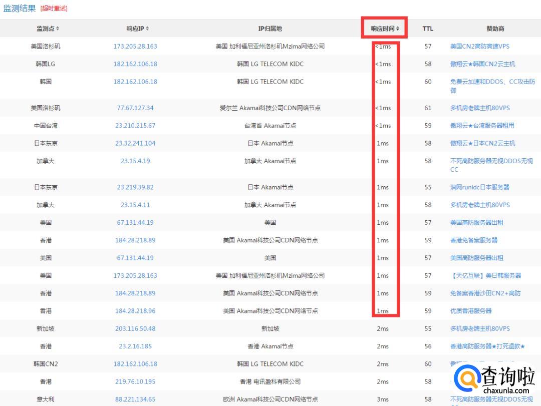 看到后面的监测结果,点击<响应时间>,然后选择<1ms或者是1ms这种延迟较小的ip复制下来。