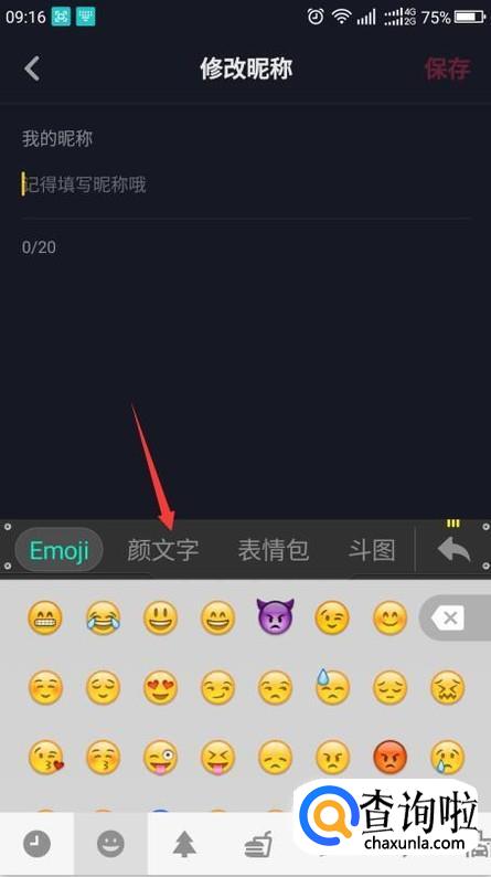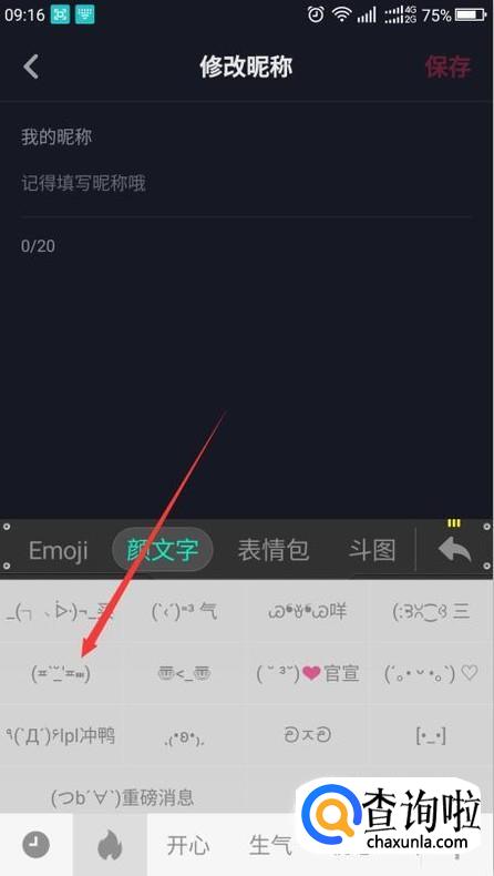 删除原来的呢称文字,再点击下方的表情按钮。再点击颜文字。