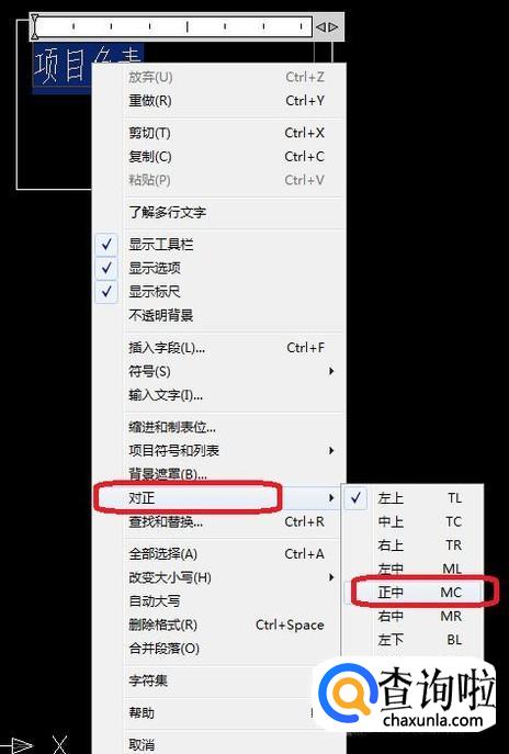 右键单击,在弹出菜单中选择“对正”,并选择“正中”。
