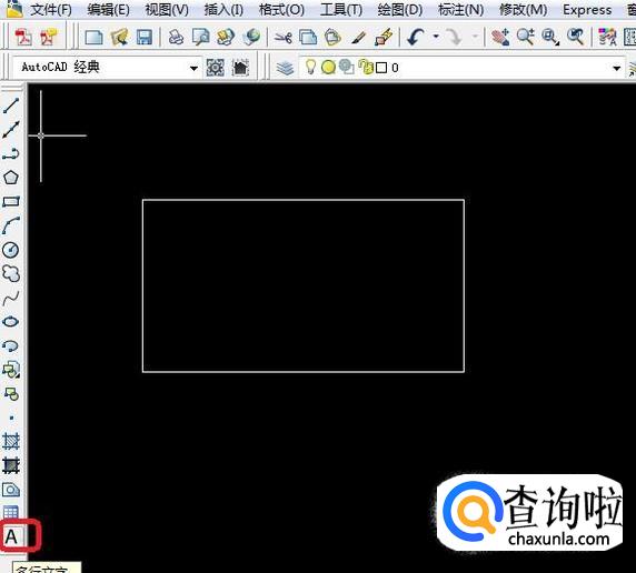 首先,我们打开CAD,输入多行文字来演示。如图所示,点击左侧工具栏的多行文字按钮,在图中方框输入多行文字。
