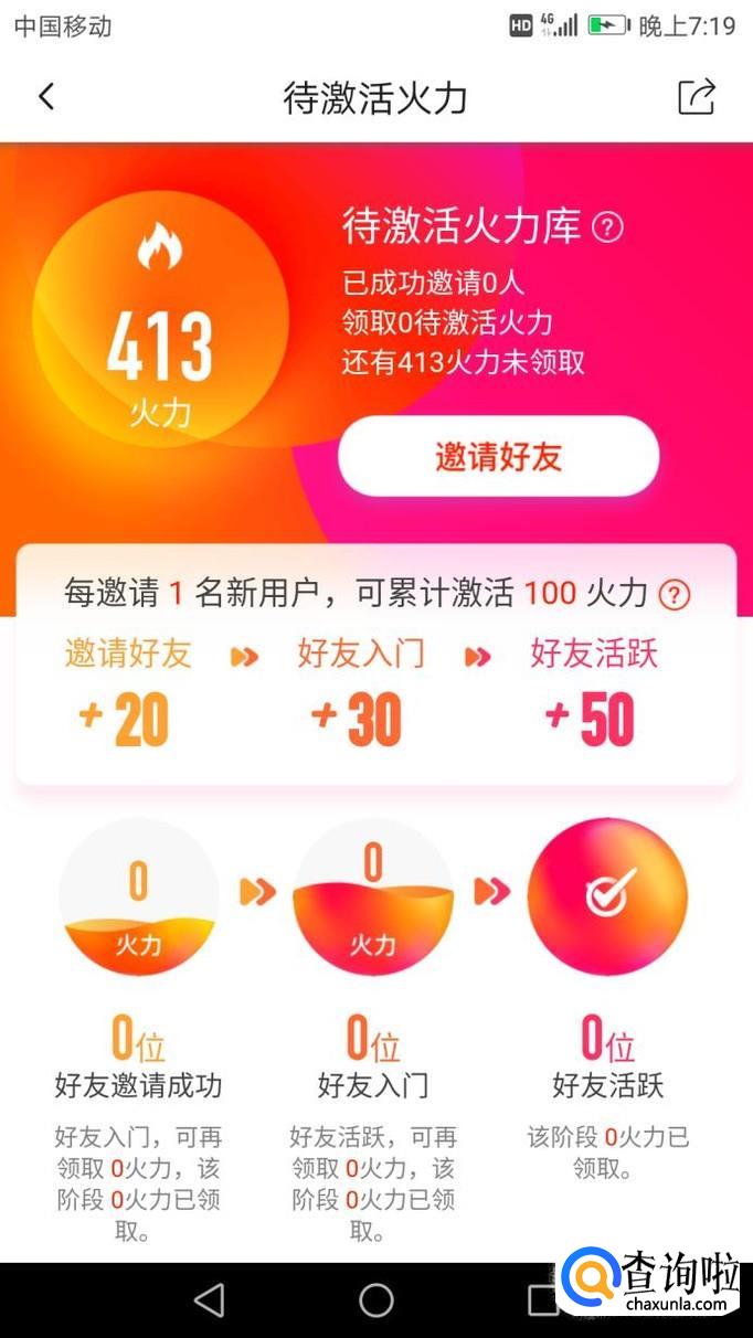 打开后,可以看见让你邀请好友就可以获得火力值,这个是获得火力值更多的途径,邀请好友越多,火力值越多,如下图。