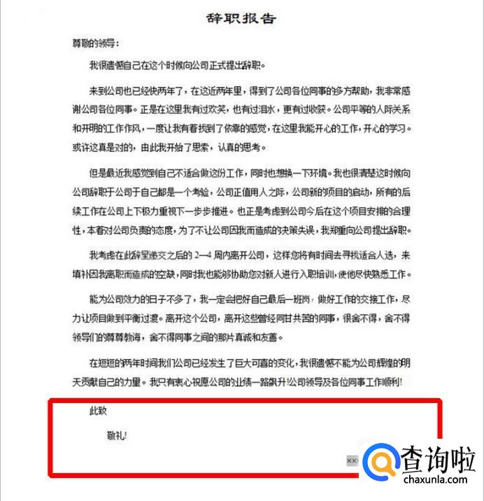 结尾要求写上表示敬意的话“此致敬礼”,意思非常明白:在此给您敬礼。辞职信的落款要求写上辞职人的姓名及递交辞职信的具体日期。