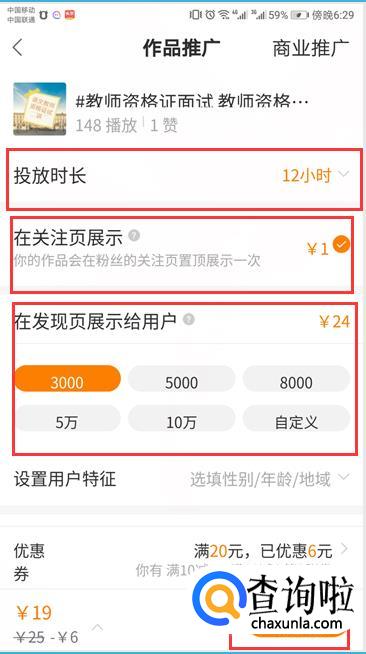 选择推广目的,点击“修改”修改投放时长,点击“自定义”修改覆盖的用户量,点击“去支付”,支付成功,作品得到推广,粉丝数量增长。
