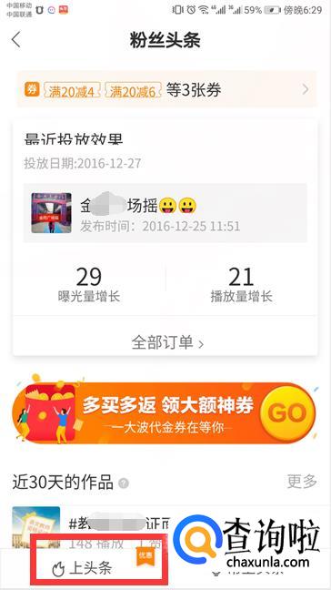 点击“推广作品”,点击“上头条”,选择优质作品,点击“购买头条”。
