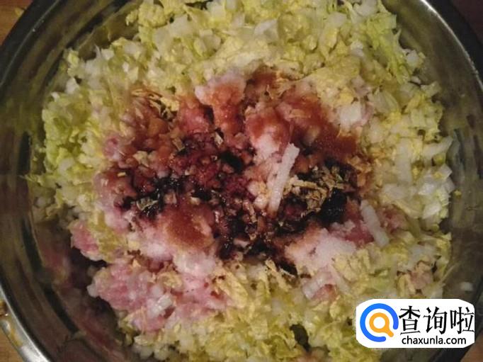 将出完水的白菜、猪肉泥放入一个方便搅拌的大碗中,加入适量的生抽、盐、老抽调味。