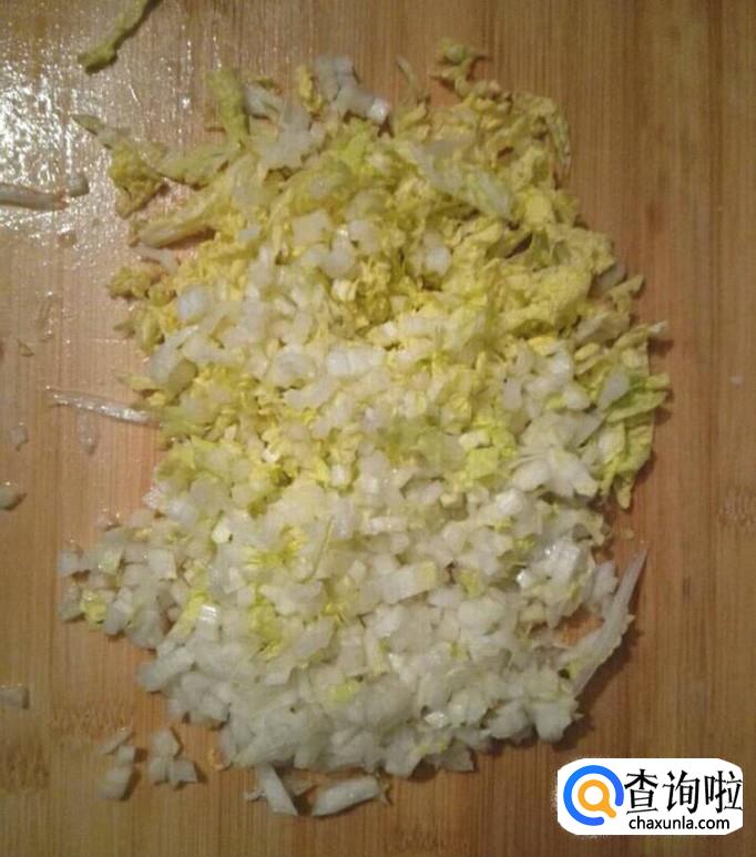 白菜叶几张叠在一起,先切丝才切碎。将切碎的白菜放入一个大碗中,加入一勺盐,出一下白菜中的水。
