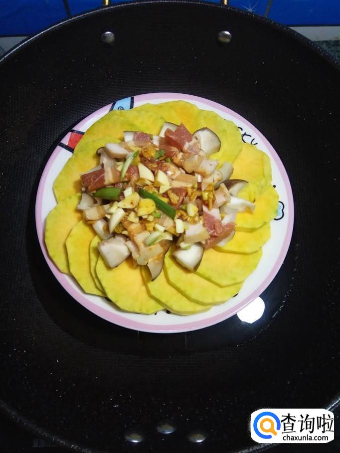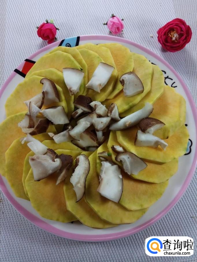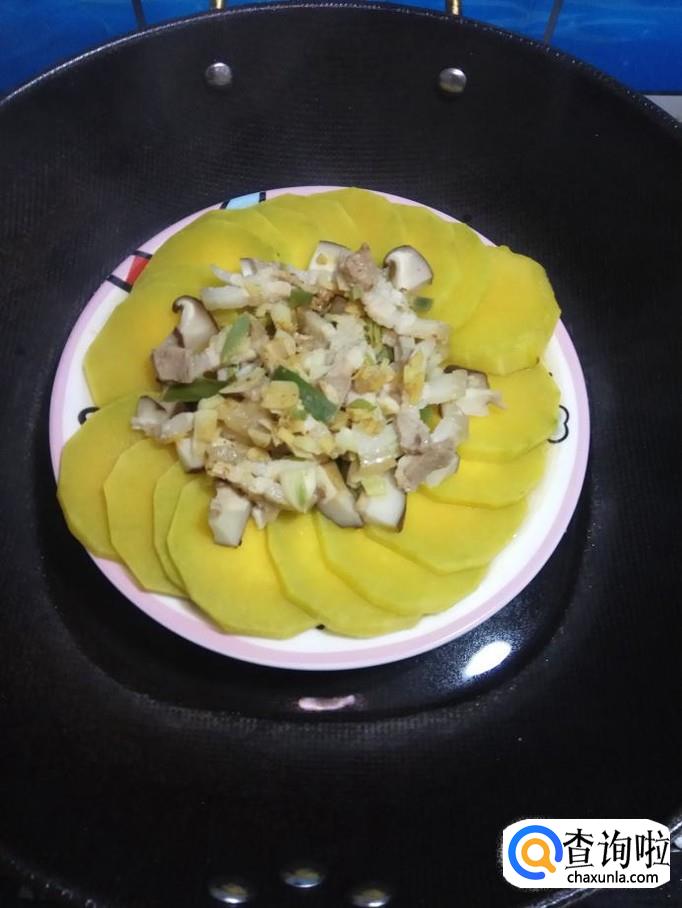 准备适量南瓜,洗净去皮后切片,摆入盘中,然后将香菇丁放在上面。