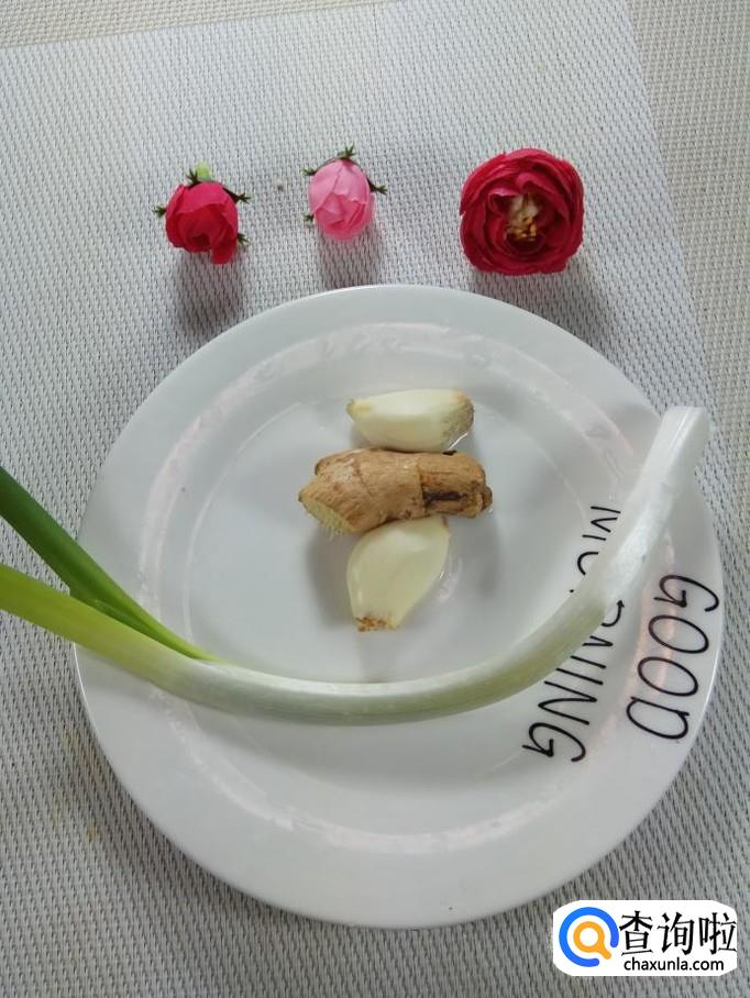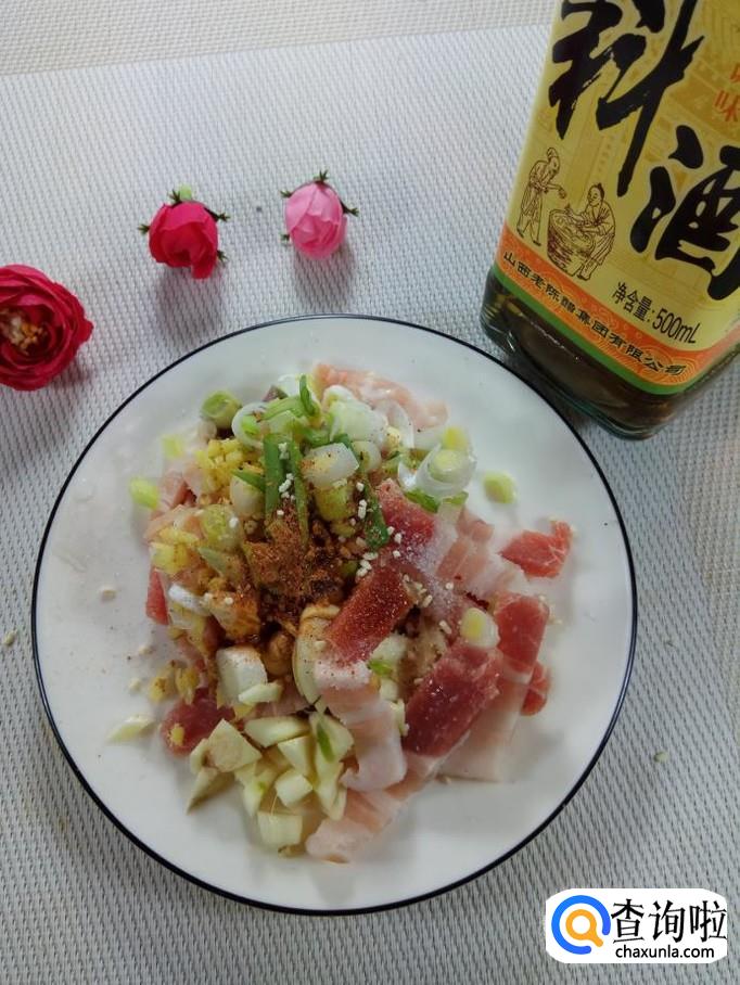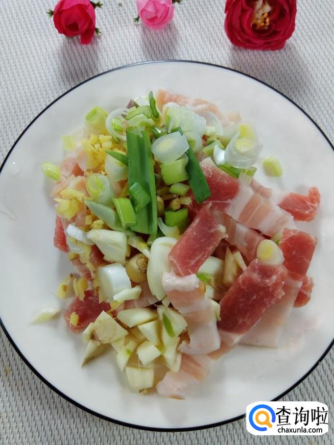 准备适量五花肉,用清水洗净后切成小条,放入盘中备用;然后再准备适量葱,姜,蒜洗净后切碎,放在五花肉上面。
