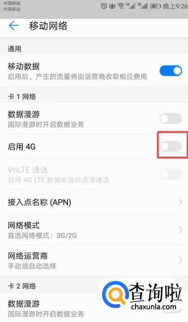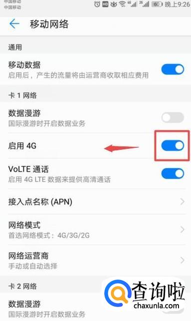 弹出的界面,我们将启用4G的开关向左滑动;