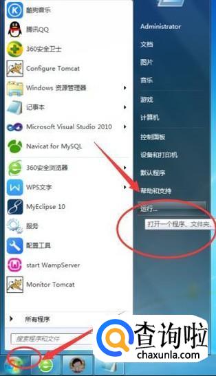 点击电脑左侧的【开始】图标,在弹出的上拉菜单中选择【运行】,如下图所示: