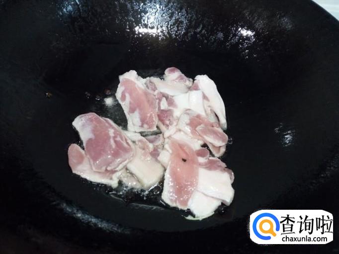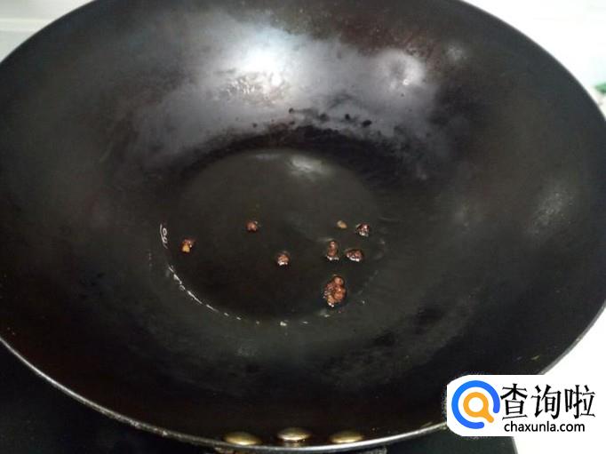 锅内放入油加热,油热后放入花椒爆锅,放入肉片翻炒。