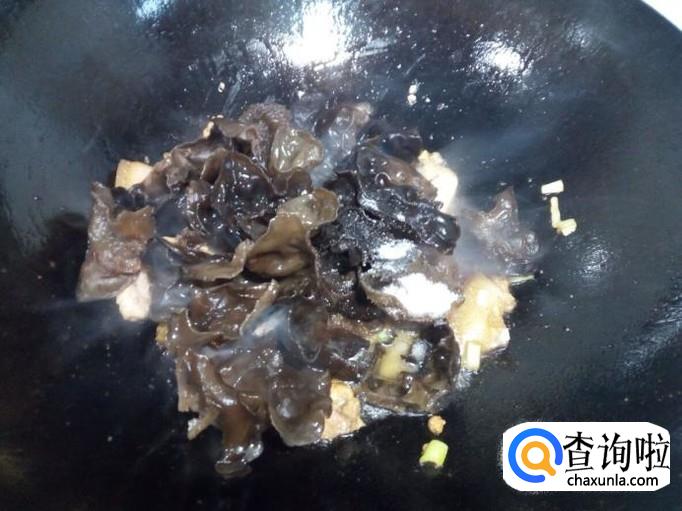 炒至肉片下油,颜色微白,放入料酒,酱油,葱,姜末,翻炒。随即放入木耳翻炒,放入盐。