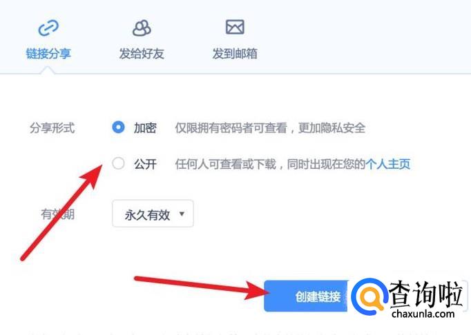 点击后,弹出分享窗口,在这里,我们选择是否要加密这个链接,选择好后,点击下方的创建按钮就行了。
