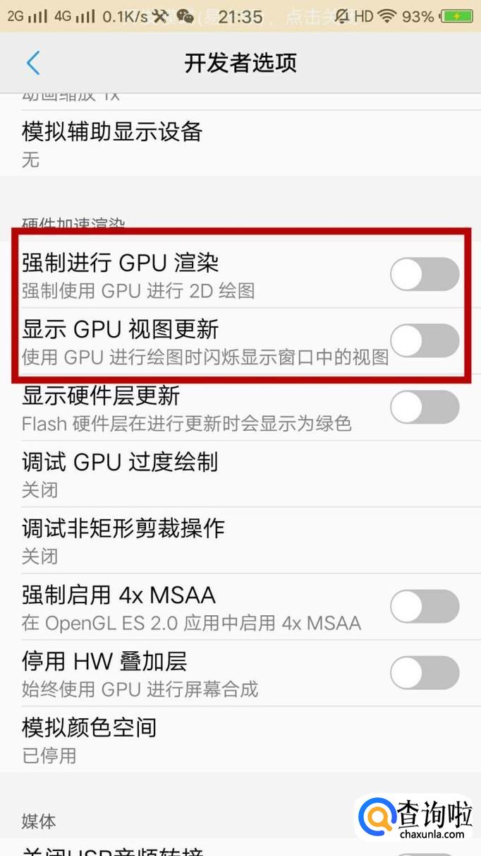 点击开发者选项,找到强制GPU渲染和强制启用4×MSAA选项,点击打勾,将其打开,这样就能增加游戏的流畅度。
